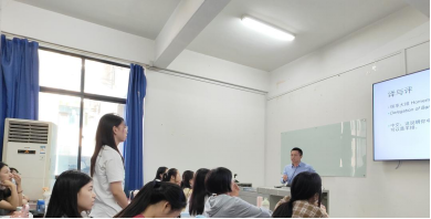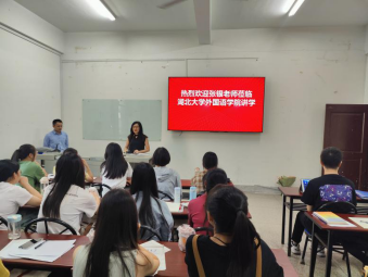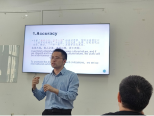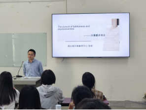 讲座伊始,张银老师用一段全英文的自我介绍开头,简略介绍了他的求员工涯和工作经历。张银老师具有历史、国际经济与贸易、翻译与传译等多学科教育背景,相继担任过新东方托福培训师、大学教师,最后入职湖北省委外事办。在谈及被问到为什么要选一个学历史的来当翻译时,张银老师引用了电影《当幸福来敲门》里面的一句话,“What would you say if man walked in here with no shirt, and I hired him? He must have had on some really nice pants.”由此可以看出张银老师对翻译的热爱和在语言方面的优势。在自我介绍后,张银老师立即邀请了口译方向的郑文灿同学做中文复述,通过这种形式的开场让大家极快的融入讲座。