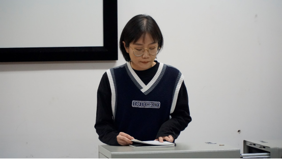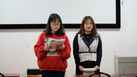 校选赛分为初赛和复赛。初赛形式为自由陈述。每个队伍抽到相应辩题之后,有十分钟的准备时间,十分钟后,队伍内两名队员自由选择正反方进行观点陈述,陈述时间为3分钟。经过评委老师们的评审和讨论,共选出四支队伍进行复赛,晋级复赛的队伍为:辩论界口译天花板队、甜橙队、三只宝队、采菱记队。